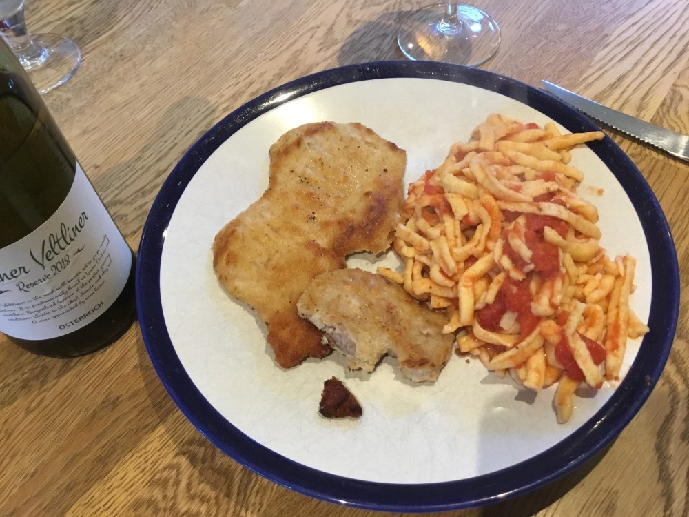 Food Pairings: We had this with schnitzel & spätzle (pictured below) and it went brilliantly. This would go equally well with fondue or charcuterie.